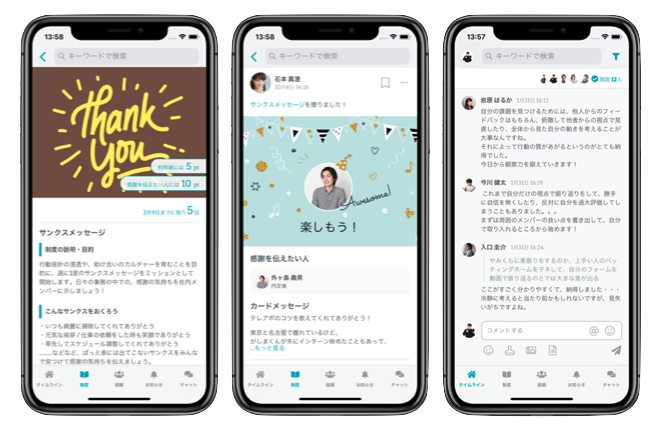 | 機能・仕様 | チャット / タスク依頼 / 日報 / ワークフロー / ナレッジ共有 / お客様の声 / 掲示板 / リンク集 / ファイル添付 / スマートフォンアプリ / 通知 / メール連携 / 検索 / メンション / プロフィール / Web社内報 / サンクスメッセージ / 社内SNS / 社内ポイント・ピアボーナス |