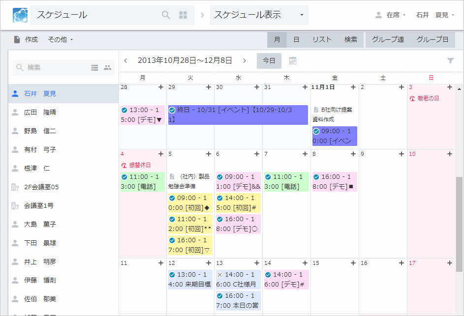 ユーザー自身のスケジュール管理はもちろんのこと、任意のユーザーグループ毎の表示、スケジュールと連動したタスク管理ができます。
