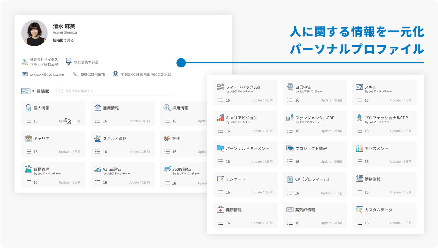 一人ひとりの意思や価値観等のキャリアプラン、結婚出産・異動希望等のライフステージ等、変動しやすい「動的データ」も入力を促す機能で確実にキャッチし、最新のデータを人事施策に活かせます。
