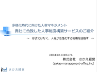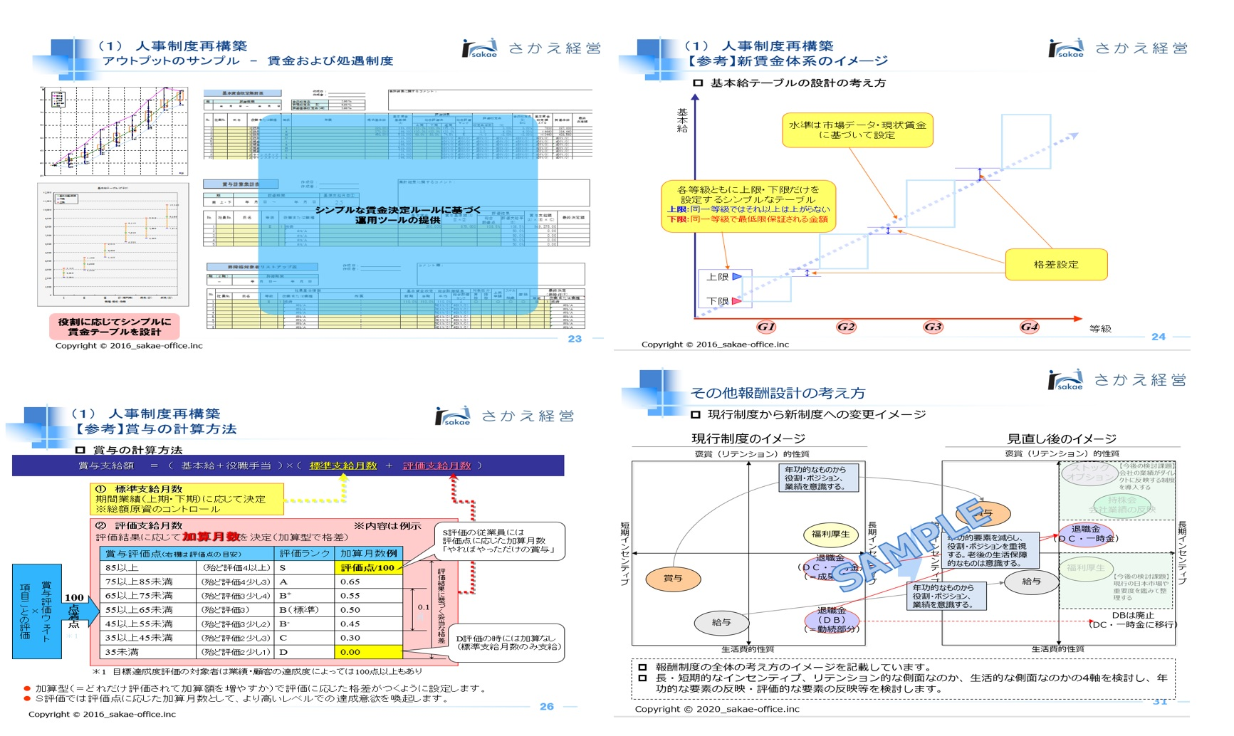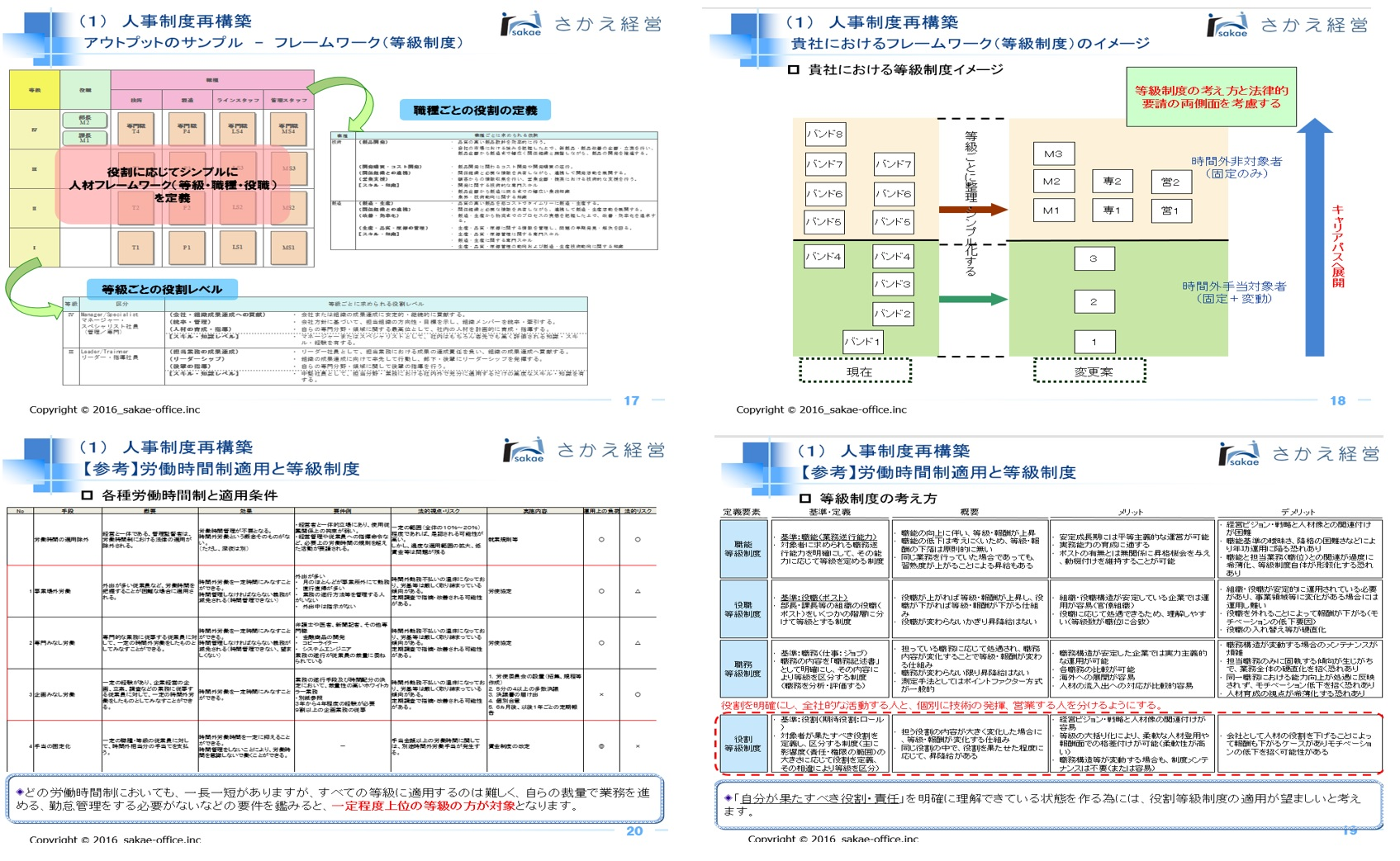 形式だけではなく、貴社の戦略・風土等に合わせた制度構築を行い、人材の活性化により、他社との競争において優位に立ちます。さかえ経営の人事制度構築は下記の5つの特長があります。 1)企業のビジネス・企業文化、経営の思想等に合致した人材マネジメントの構築 コンサルティング会社の多くが、ある程度のテンプレートがあり、その内容に当てはめようとする場合が多々あります。さかえ経営も勿論、豊富な実績を元にしたテンプレートはありますが、単なる当てはめではなく、企業の特性を十分に理解して上で、その内容を大きくアレンジして、企業独自のものを安価にスピーディーに構築します。 2)運用を重視した人材マネジメントの構築 人事制度、評価制度をはじめとした、人材マネジメントの論点は、実際に企業が活用してはじめて目的が達成されます。しかしながら、制度構築のみに終始し、運用の視点がなく、形骸化した制度が多々あります。さかえ経営では、各現業部が自ら進んで運用している状態を目指して、最適な運用プランをご提供します。 3)多様化する人材の価値観を意識した人材マネジメントの構築 人材の価値観はここ30年で大きく変化しました。それ以前は皆が同じ価値観であったため、比較的画一的な対応で良かったですが、現在の人の価値観に合致し対応が必要になってきます。さかえ経営では、人材の特性・価値観を見極め、企業の成長は勿論、従業員の満足を満すことを目的としたサービスを提供します。 4)人件費のコントロール、市場価値を意識した人材マネジメントの構築 最終的な人件費等の枠はそれぞれ決まっているかと思います。人材マネジメントの構築・改善は時として、コストがかかる場合があります。勿論、一定のコストは必要なのは否定しませんが、ポイントしては、どのコストを厚くして、どのコストを低減させるかということだと思います。市場等を踏まえて、コストコントロールの手法と優先順位を整理します。 5)人材マネジメントの目的の明確化と一本化 さかえ経営では、人材マネジメントを導入するにあたって「何故、導入するのか」「何故、見直すか」などを十分に議論します。その内容を掲げると共に、時として、各論に入ると最初の目的を見失う時もあります。その場合も、本来の目的に立ち返って、議論を修正することにより、一貫性のある人材マネジメント体制の構築を目指します。