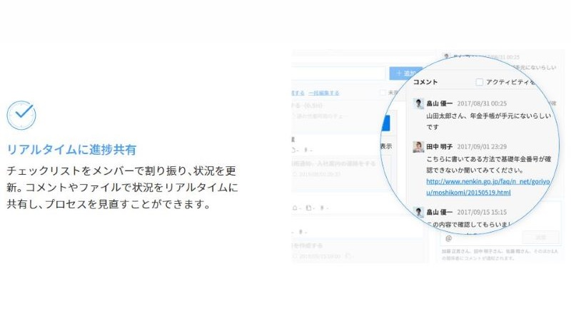 チェックリストをメンバーで割り振り、状況を更新。コメントやファイルで状況をリアルタイムに共有し、プロセスを見直すことができます。