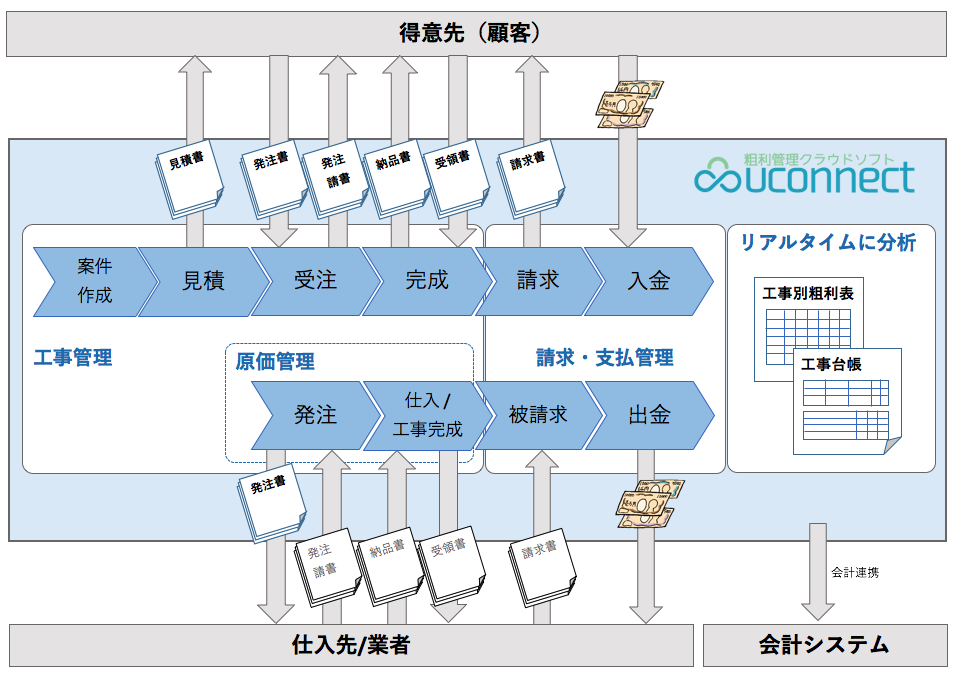 uconnect は、工事台帳を簡単に作成でき、工事に関するの見積書・発注書・発注請書・請求書など、工事業務で使用する各種帳票を出力することができるクラウド型のサービスです!