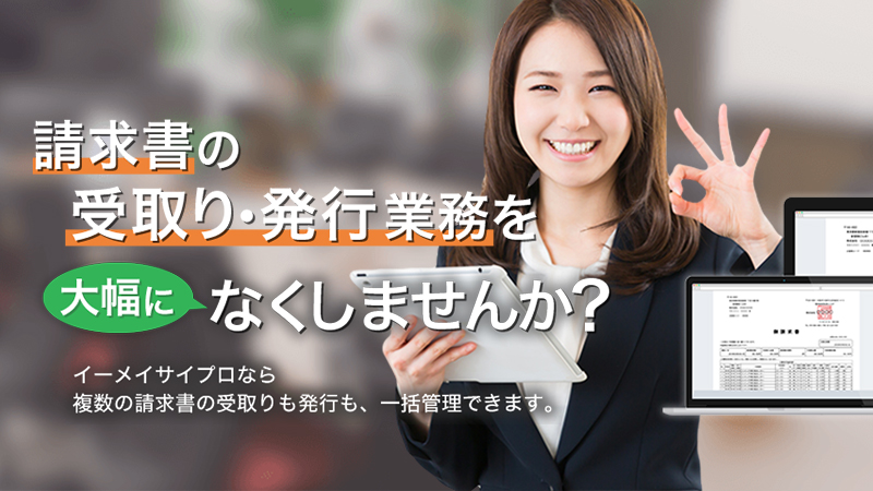 e-メイサイプロは請求書の発行・受取りがクラウド上でかんたんにできる請求書作成サービスです。様々な形式で送付される請求書を電子化し、フォーマットを統一することで一括管理が可能です。月次決算を迅速に行いたいという受取側はもちろんのこと、毎月の請求業務を効率的行いたいという発行側の企業にもおすすめのサービスです。