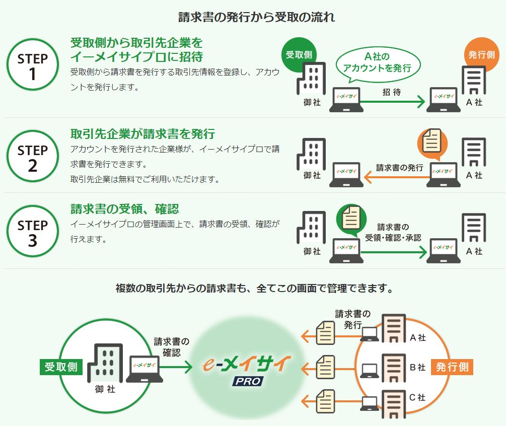 また、受取側が発行側の企業情報を入力してアカウントを発行すれば、招待された発行側企業は無料でe-メイサイプロを利用することができるため、トラブルのリスクもありません。