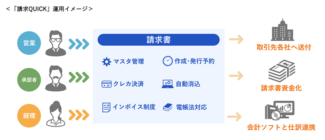 請求QUICKは、請求書の作成から発行(メール/郵送)、入金確認、その後の経理処理まですべてWeb上で完結できるクラウドサービスです。
