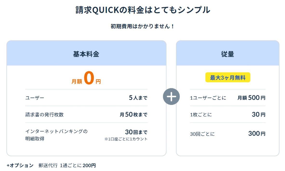 「請求QUICK」は、ご利用人数5人、請求書発行枚数50枚までなら「月額料金無料」でご利用いただけます。