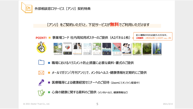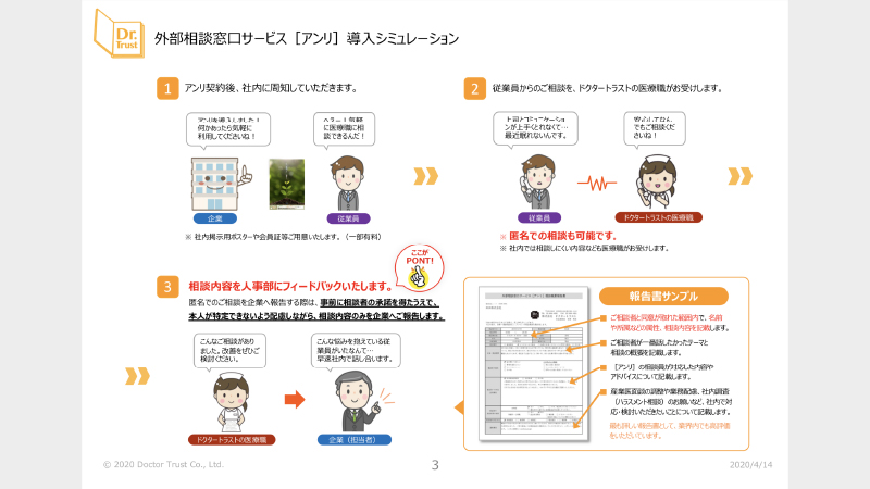 産業保健に精通した保健師、精神保健福祉士、公認心理師などドクタートラストの医療資格者がご対応します。社内では相談しにくいこともプロなら安心。一般的には、①受付→②産業医や保健師など医療職→③医療機関といった流れのところ、アンリは窓口受付時から医療職が対応できるため、迅速な対応が可能です!また、ハラスメントだけでなくフィジカルやメンタルの問題も一元的に対応が可能といった大きな特徴があります!