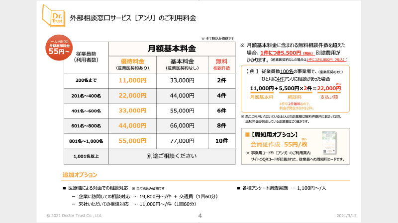 ドクタートラストのEAPサービス ・月額11,000円(税込)という驚きの低価格、なのに最高品質 ・保健師、精神保健福祉士、公認心理師などの医療職が対応 ・詳しい報告書に加え医療職からのアドバイスも受け取れます