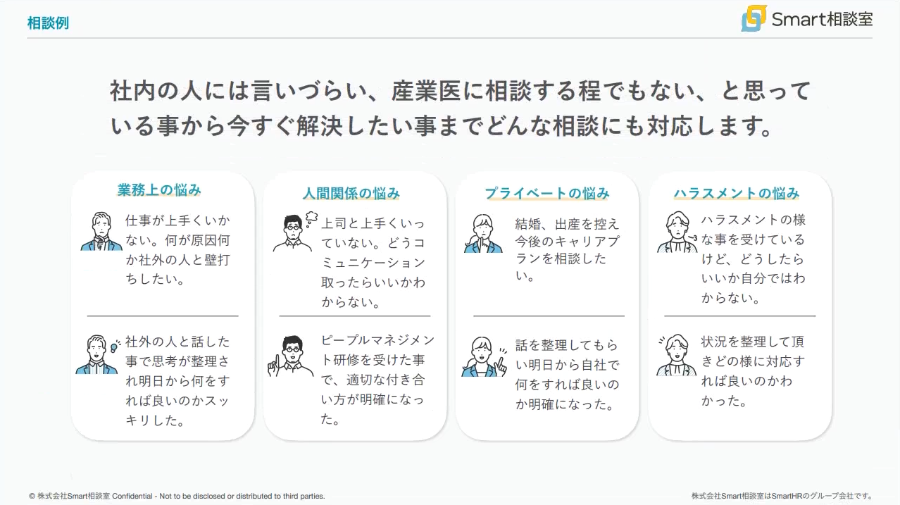 「Smart相談室」は、オンラインカウンセリングの仕組みを活用して、従業員のモヤモヤを解決するサービスです。従業員それぞれのモヤモヤ、求めている内容に応じて、カウンセリングからコーチング、研修、ハラスメント窓口の役割を提供します。