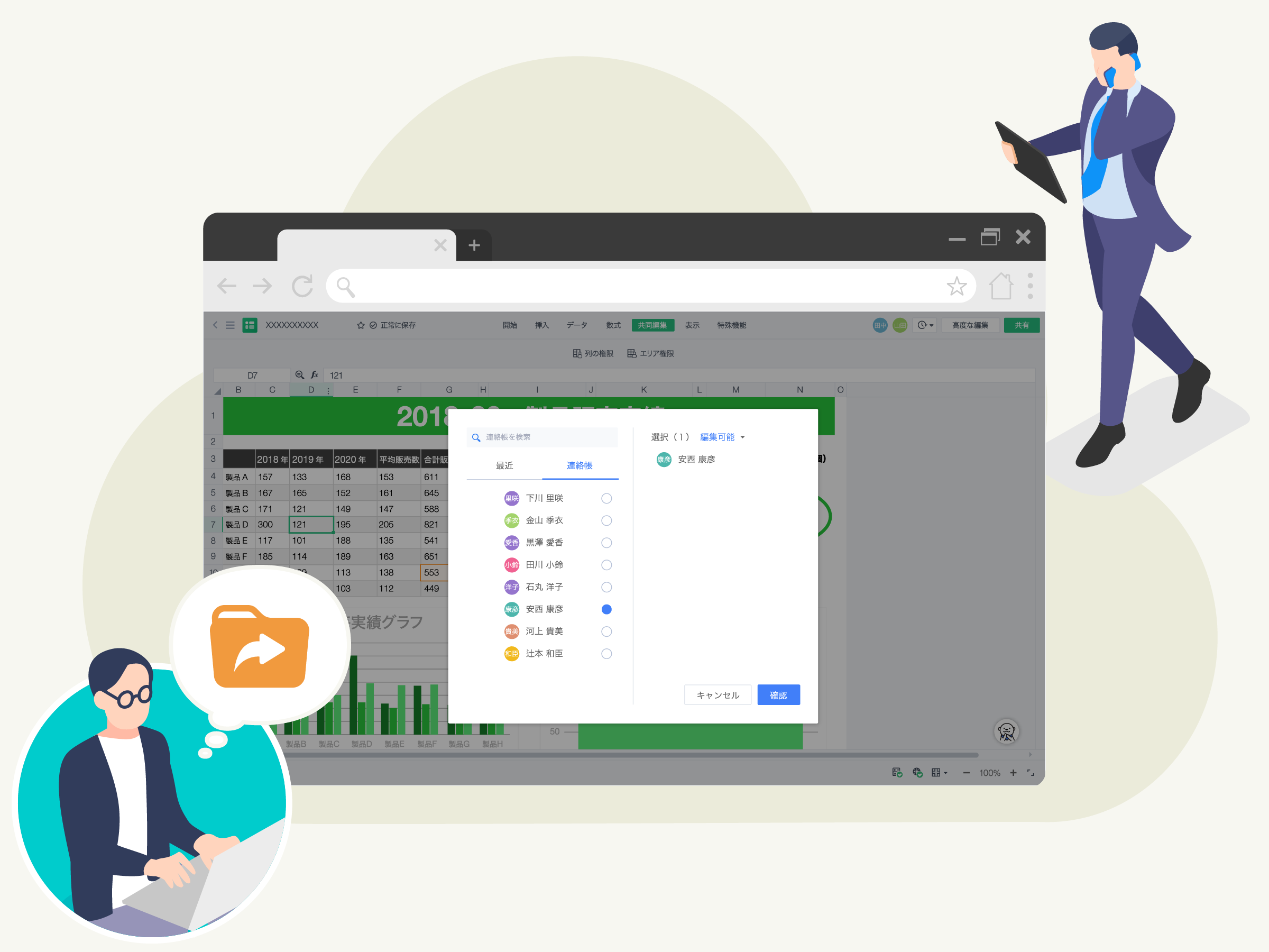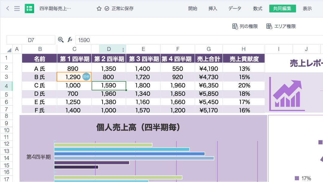 「文書作成」「表計算」「スライド作成」の他、高度なPDF編集に対応。クラウド型オフィスのため、ファイルはクラウドストレージ上に保存されます。保存したファイルは簡単に他のユーザーと共有できます。共有したファイルはリアルタイムで同時編集可能です。