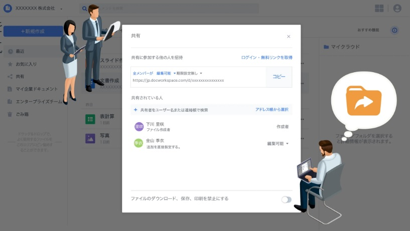 企業外へのファイル共有、ファイル転送について制限を設けることが可能です。社外からのアクセス制限でより高いセキュリティを担保できます。