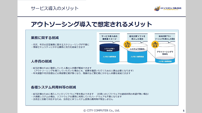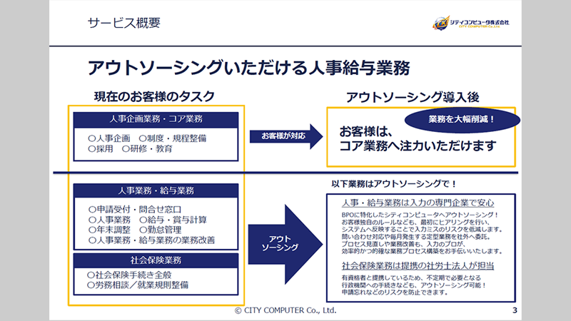 シティコンピュータが提供している「給与計算アウトソーシング」をコンパクトに分かり易くご紹介しています。 煩雑な給与計算業務でお悩みのお客様はぜひご覧ください。