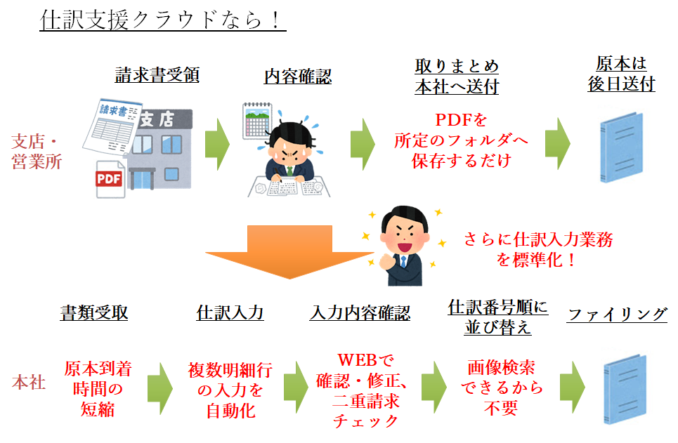 請求書仕訳支援クラウドは、クラウド上に請求書情報をアップロードするだけで仕訳処理を自動化するサービスです。