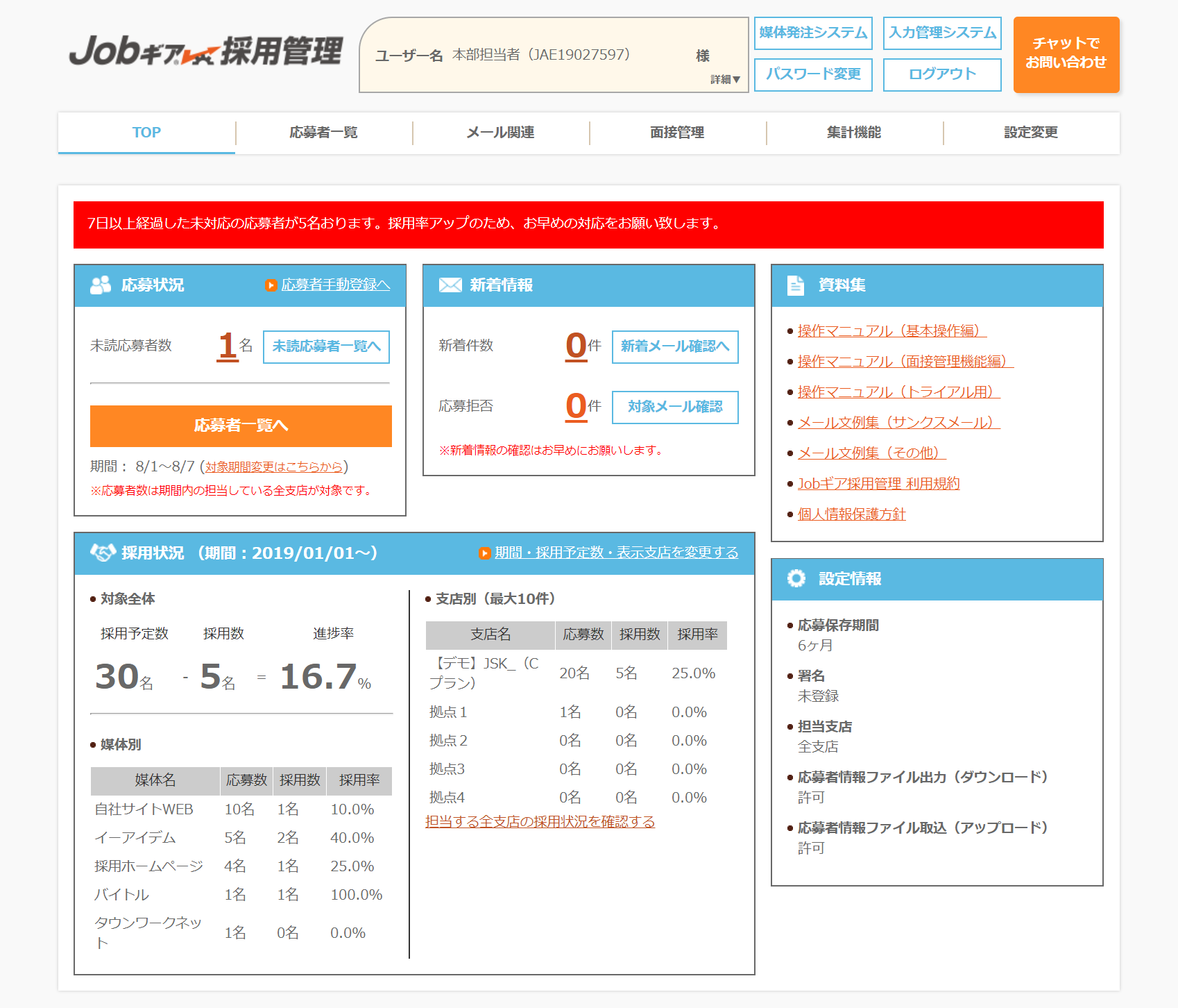 一定期間未対応の応募者がいる場合、担当者に通知され、対応遅れを防ぎます。