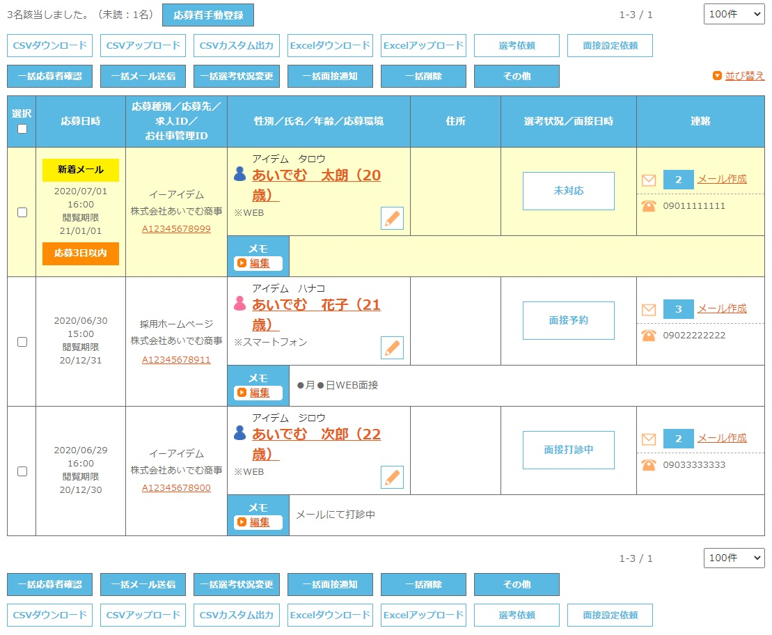氏名・性別・年齢はもちろんのこと、応募媒体や応募先の支店、選考状況など、一画面にまとめることで応募者の情報を素早く確認できます。