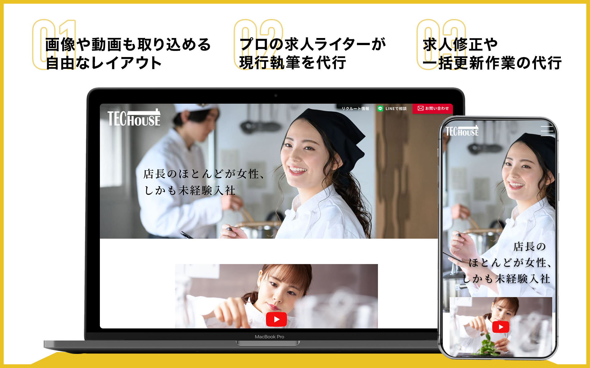 自社採用HPの独自デザイン制作、SEO強化といった応募集客にも強いサービスです。