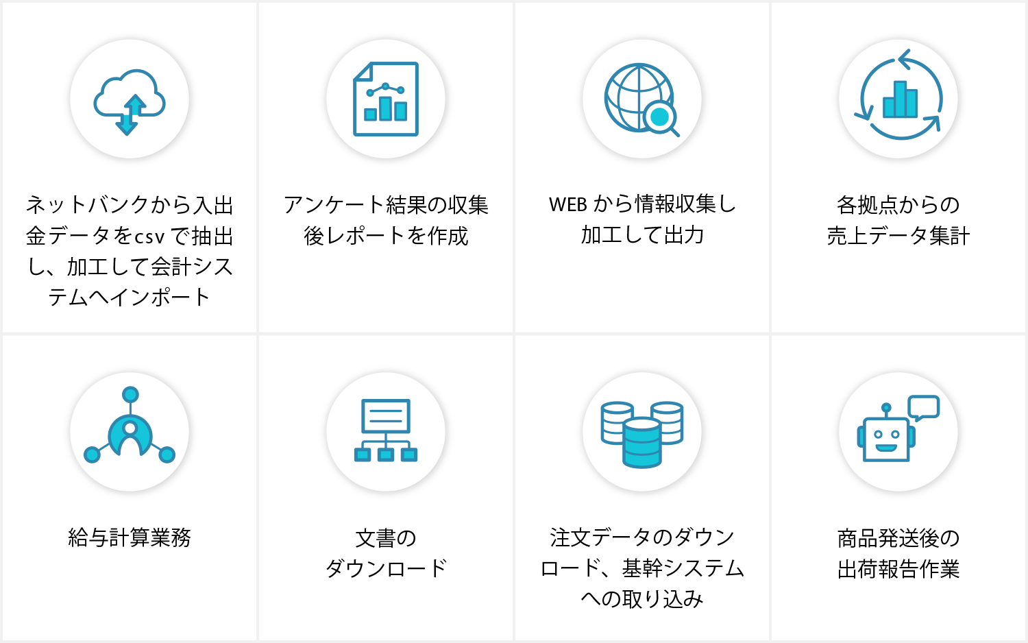 データ入力業務・集計業務・加工業務・送信メール処理業務・ファイル保存処理業務など、幅広い範囲でご活用いただけます。