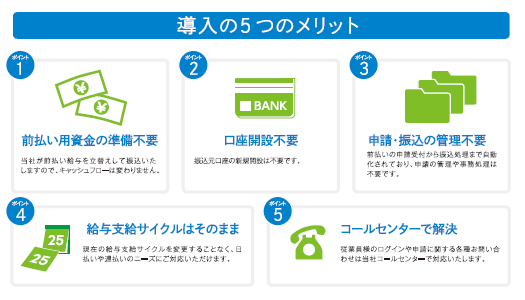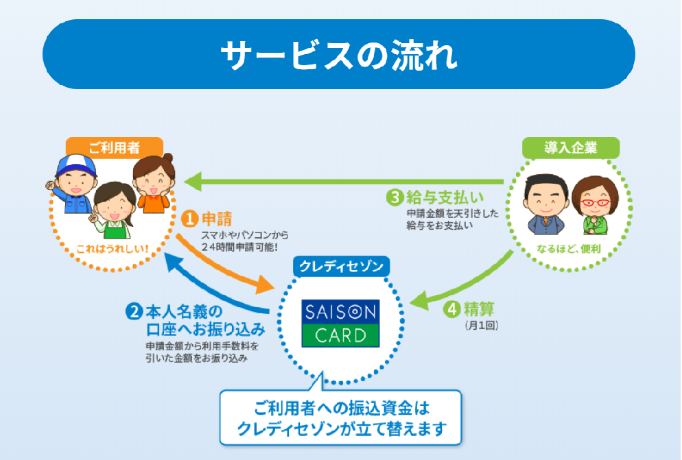前払いの申請には、クレディセゾンが立替えをして対応し、原則給与支給日に精算をさせていただきます。そのため資金の準備や管理は不要で、キャッシュフローも変えずに導入いただけます。