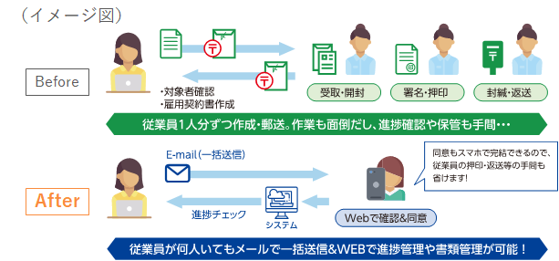 これまで【書面+押印】で締結・更新していた雇用契約を、【電子データ(PDF)+WEB上の同意】に切替することで、契約にかかるコスト、業務負荷、所要時間等を削減でき、業務効率化が図れます。