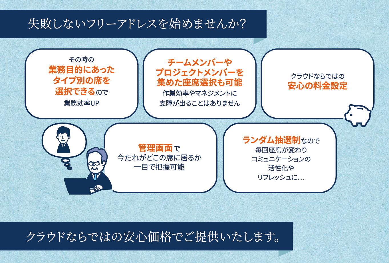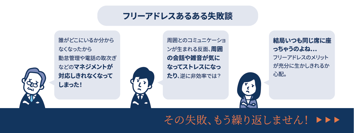 しかし、フリーアドレスを導入しても、いつもの席を使ってしまう、マネジメントがしづらい、といった習慣的障壁により「なかなか定着しない」というお悩みをお持ちの企業様が多いのも事実。