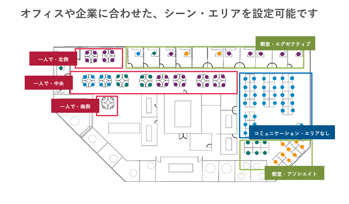 その日行う業務に合わせた座席を選出して指示するので、空いている席を探すといった動作は不要。自分の一日を最適な座席で過ごすことができ、業務効率UPに役立ちます。