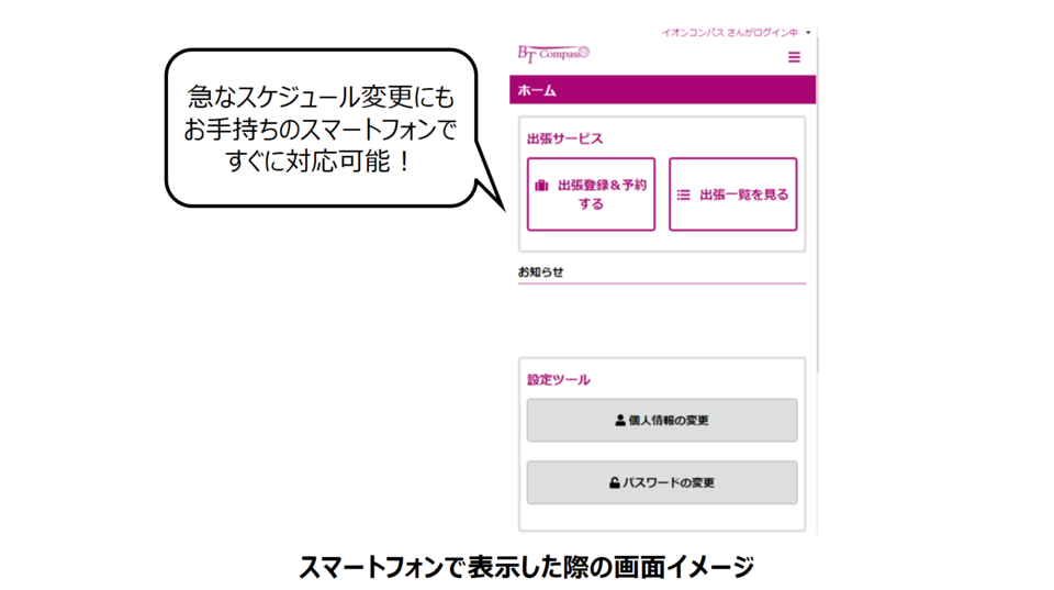 イオングループの旅行会社、イオンコンパス株式会社が提供する『BT-compass』は、国内の出張を一元化し管理できるクラウド型出張管理システムです。