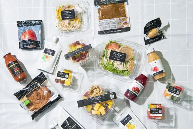「オフィスでやさい」プランでは、サラダやフルーツ、サラダチキン、ヨーグルト、豆腐製品などのヘルシーフードはもちろん、お昼ごはんになるご飯やお惣菜など、通常200〜300円する商品を従業員は100円〜購入可能です。