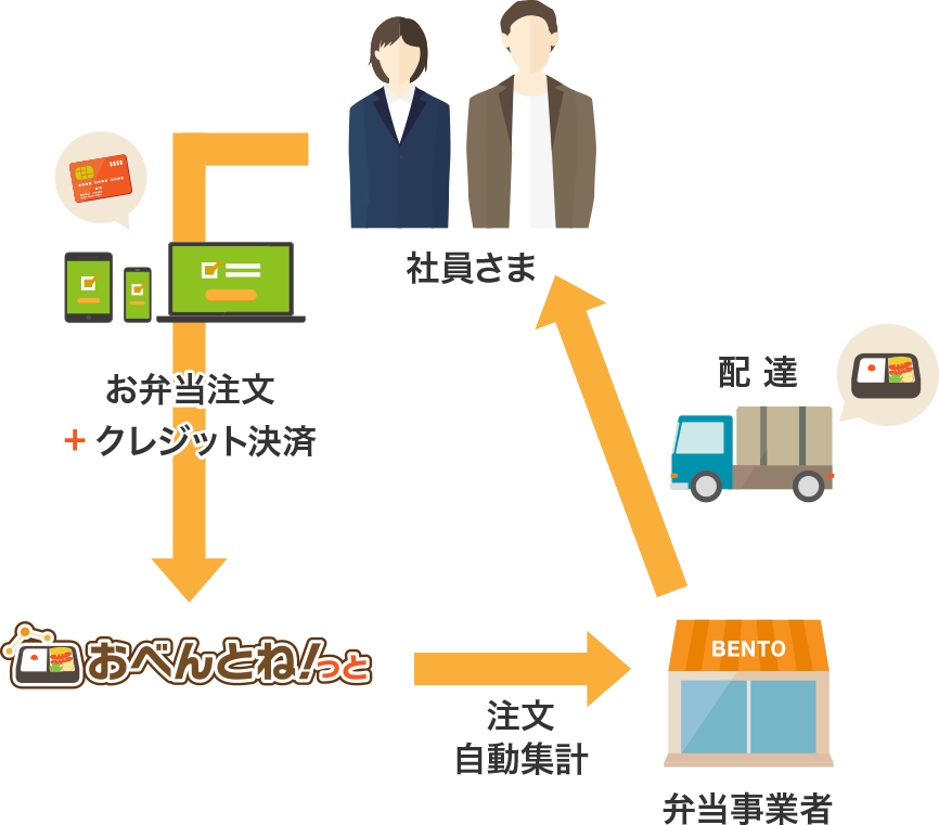 「おべんとね!っと」は、2001年にサービスを開始。以来、首都圏を中心に機能やサービスエリアを拡大しながら、今では全国約500社にサービスを展開しています。利用方法はかんたん。従業員が会社PC・スマホからインターネットで注文するだけ。オフィス単位で注文を集計し、お弁当屋さんがお届けします。現在、30社以上の大手優良企業を含める多くのお弁当会社と提携しており、配達可能なお弁当屋さんをご紹介します。忙しい従業員様が健康的で快適な食生活を送れるようカスタマーサポートも充実、食を通して貴社の健康経営・生産性向上に貢献します。