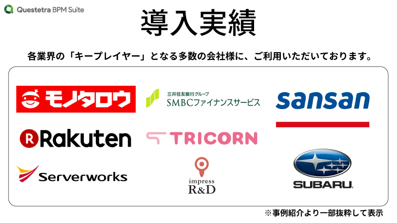 ご利用中のお客様には上場されている企業も存在し、Questetra BPM Suiteの利用によりスムーズに監査を進めることができたとの声もいただいております。