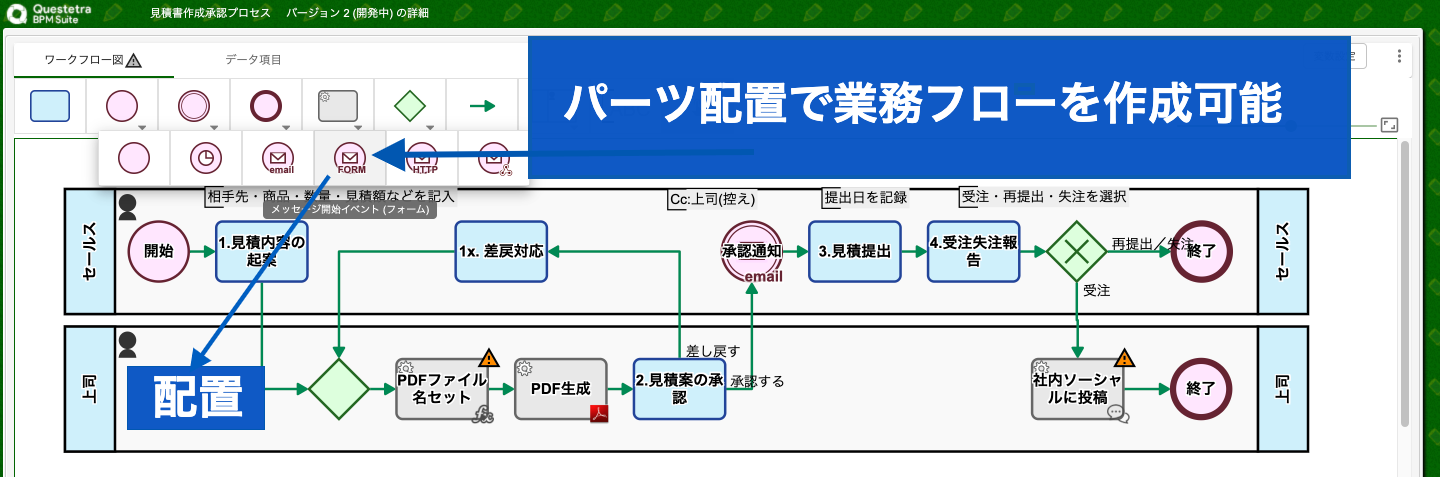Questetra BPM Suite はワークフローや業務プロセスを「ドラッグ&ドロップ」で可視化・構築し、デジタル化することができます。